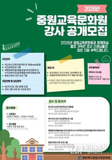 [경기뉴스원/경기뉴스1] | 충청북도교육청 직속기관 중원교육문화원은 23일까지 학생과 학부모, 지역주민을 대상으로 운영하는 2026년도 인문독서 및 문화예술 프로그램 강사를 공개 모집한다고 밝혔다.