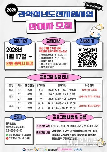 [경기뉴스원/경기뉴스1] | 관악구가 구직을 단념한 청년들의 사회 진입을 돕기 위해 오는 1월 17일부터 ‘2026년 청년도전지원사업’ 참여자를 모집한다.