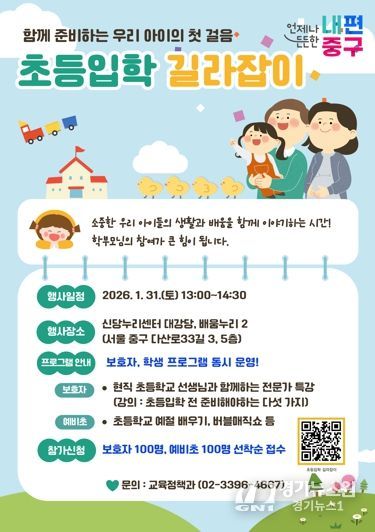 [경기뉴스원/경기뉴스1] | 서울 중구가 ‘2026 초등입학 길라잡이’ 설명회를 오는 31일 오후1시부터 신당누리센터 대강당에서 개최한다. 예비 초등학생과 학부모를 대상으로 약 1시간 반 동안 현직 교사가 첫 학교생활에 대한 궁금증을 해소해 줄 예정이다.