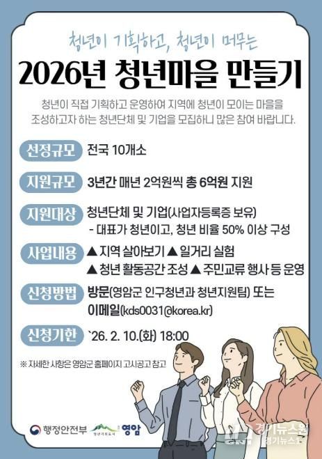 [경기뉴스원/경기뉴스1] | 영암군이 행정안전부 ‘2026 청년 마을 만들기 사업’에 참여할 청년단체를 다음달 10일까지 공개 모집한다.