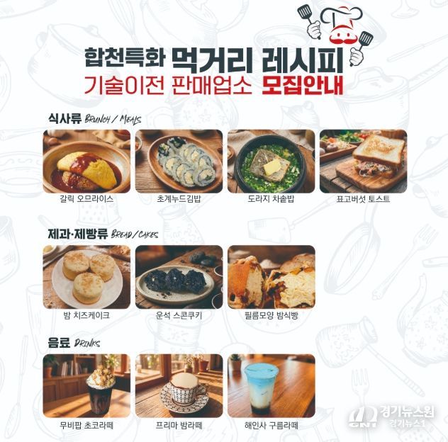 [경기뉴스원/경기뉴스1] | 합천군은 지역 특산물을 활용한 차별화된 먹거리를 보급하고 관광객들에게 풍성한 미식 경험을 선사하기 위해 ‘합천특화 먹거리 레시피 기술이전 및 판매업소’를 2026년 1월 19일 월요일부터 2월 20일 금요일까지 모집한다고 밝혔다.