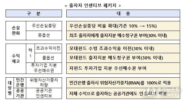 지역사회가 참여하는 모펀드별 ‘운영위원회’를 설치하고 지역투자 재원 확보를 위해 출자자 인센티브 패키지를 제공한다. 인센티브는 손실은 낮게, 수익은 높게, 대상은 넓게 설정한다. 지역 기반 벤처캐피탈 육성을 위한 지역운용사 인센티브도 운영할 계획이다.