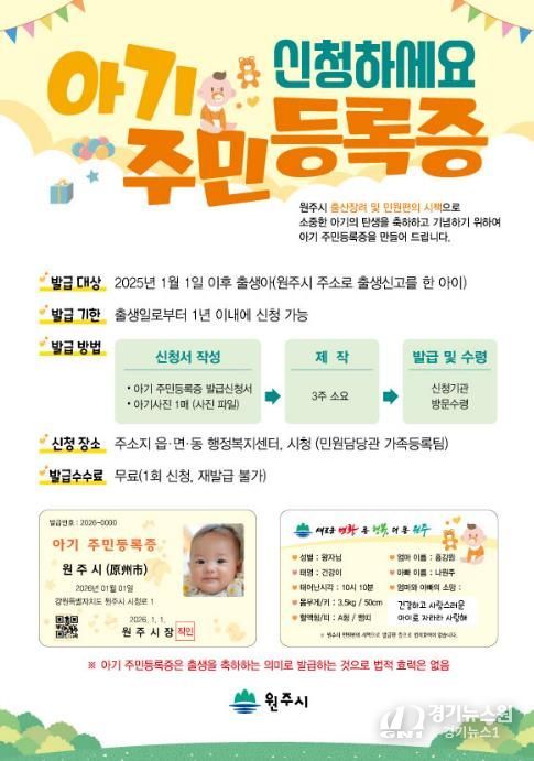[경기뉴스원/경기뉴스1] | 원주시는 출산 장려 및 민원 편의를 위해 ‘아기주민등록증’ 무료 발급 사업을 올해도 지속해서 추진한다.