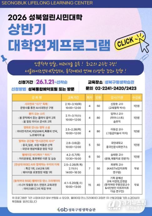 [경기뉴스원/경기뉴스1] | 서울 성북구가 2월부터 5월까지 구민을 대상으로 ‘2026 상반기 열린시민대학’을 운영한다.