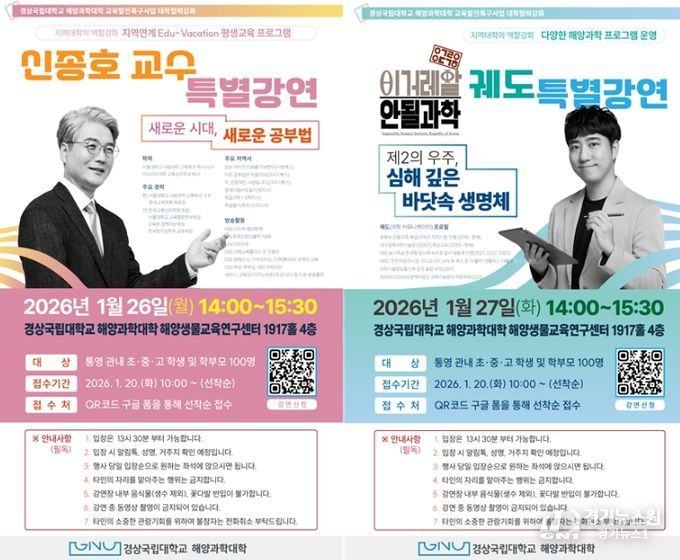 [경기뉴스원/경기뉴스1] | 경상국립대학교 해양과학대학은 통영 관내 초·중·고 학생과 학부모를 대상으로 한 명사 초청 특강을 1월 26일과 27일 양일간 잇따라 개최한다.