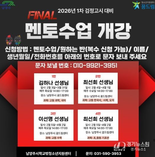 [경기뉴스원/경기뉴스1] | 남양주시는 오는 2월 3일부터 남양주시학교밖청소년지원센터에서 학업을 중단한 청소년을 대상으로 ‘2026년도 제1회 검정고시 대비 학습 멘토링 프로그램’을 운영한다고 밝혔다.