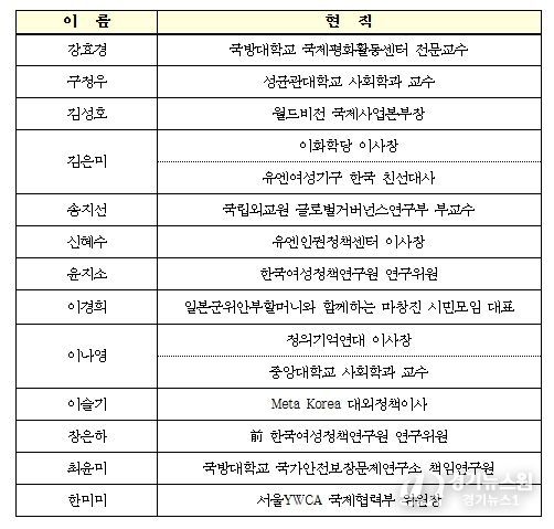 [경기뉴스원/경기뉴스1] | '여성과 함께하는 평화 구상(Action with Women and Peace Initiative)' 2기 자문위원회가 1월 21일 출범했다. 금번에 출범한 2기 자문위원회는 여성‧평화‧안보, 인권, 개발협력, 사이버 등 분야에서 활동 중인 13명의 학계, 시민사회 등 민간 전문가로 구성되어 앞으로 동 구상 추진 과정에서 다양한 자문을 제공하게 된다.