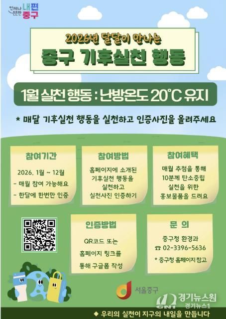 [경기뉴스원/경기뉴스1] | 서울 중구가 올해부터 '달달이 기후실천 행동'을 운영하며 주민들의 녹색생활 실천의지를 북돋는다. 올해 첫 미션은 ‘난방온도 20℃ 유지하기’고, 다음달 미션은 '대중교통 이용하기'다.