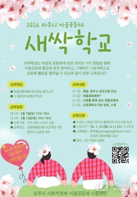 아울러 시는 마을미디어형과 기본사회형 지정공모를 신설해 지원 분야를 확대했으며, 마을공동체지원센터를 통해 2월 23일까지 사업계획서 작성을 지원하는 개별 자문도 병행할 예정이다. 신청은 파주시 사회적경제·마을공동체 지원센터 누리집에서 가능하다.
