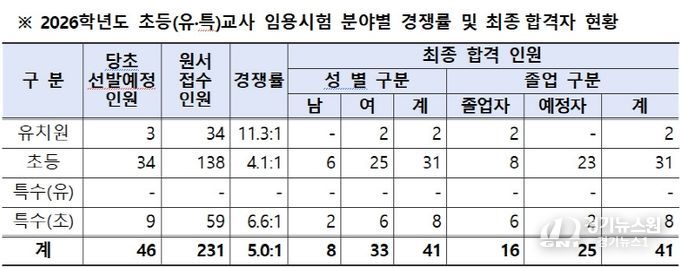 분야별 최종 합격 인원은 유치원 2명, 초등 31명, 특수(초등) 8명이다. 합격자 현황을 성별로 보면 남자 8명(19.5%), 여자 33명(80.5%)이며, 학력별로는 졸업자 16명(39%), 졸업예정자 25명(61%)으로 집계됐다.
