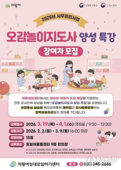 [경기뉴스원/경기뉴스1] | 의왕시 여성새로일하기센터가 '오감놀이지도사 양성 특강'의 교육생을 모집한다.