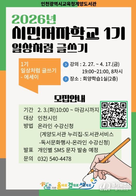 [경기뉴스원/경기뉴스1] | 인천광역시교육청계양도서관은 시민의 글쓰기 역량을 높이고 창작 경험을 지원하기 위해 2026년 시민저자학교 1기 ‘일상처럼 글쓰기(에세이 편)’를 운영한다.