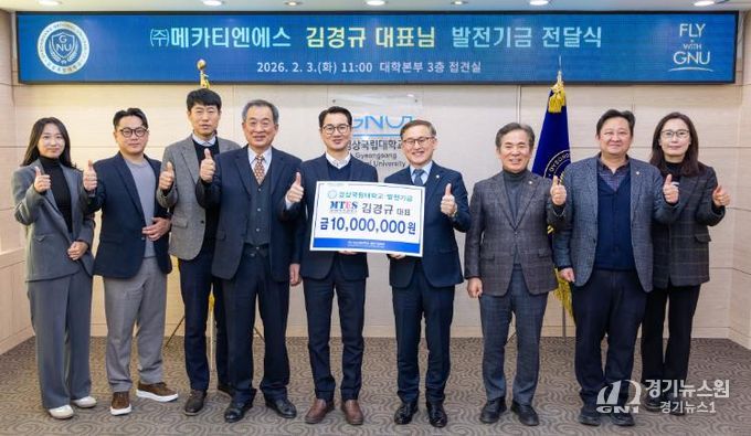 [경기뉴스원/경기뉴스1] | 경상국립대학교는 2월 3일 오전 11시 대학본부 3층 접견실에서 ㈜메카티엔에스 김경규 대표가 대학발전기금 1000만 원을 기부했다고 밝혔다.