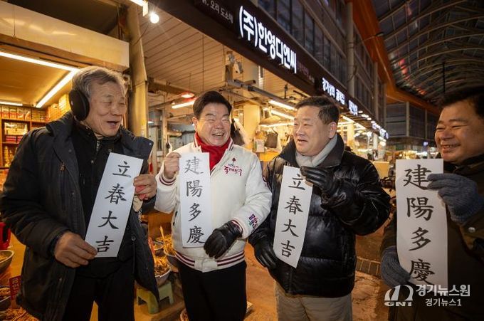 특히 이번 일정은 4일 ‘입춘’을 앞두고 진행돼 분위기가 남달랐다. 입춘은 24절기 가운데 첫 절기로 ‘봄의 시작’을 알리는 날로, 예로부터 대문에 ‘입춘첩’을 붙이며 한 해의 복을 기원해 왔다. 이 구청장과 상인들은 ‘입춘대길 건양다경(立春大吉 建陽多慶)’이라 적힌 종이를 함께 들어 보이며 환하게 웃는 사진을 남기기도 했다. 이 문구는 입춘에 많이 쓰이는 글귀로 “봄이 드니 크게 길하고, 좋은 경사가 많기를 바란다”는 뜻을 담는다. 구는 “설을 앞둔 시장의 분주함과 입춘이 상징하는 새출발의 기운이 맞물려, 주민과 상인 모두에게 작은 희망이 되길 바라는 마음”이라고 전했다.
