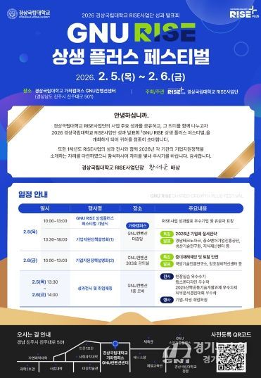 [경기뉴스원/경기뉴스1] | 경상국립대학교 라이즈(RISE) 사업단(단장 황세운)은 2월 5~6일 가좌캠퍼스 GNU 컨벤션센터 대강당 일원에서 RISE사업의 1차 연도 성과발표회 및 기업지원정책 설명회 ‘GNU RISE 상생 플러스 페스티벌’을 개최한다.