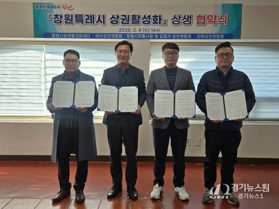 [경기뉴스원/경기뉴스1] | 창원시상권활성화재단(이사장 장금용)은 2월 4일 오후 2시, 창원시상권활성화재단 어울림센터에서 마산통합상인연합회, 창원시 전통시장 및 상점가 상인연합회, 진해상인연합회(대표시장: 진해중앙시장)와 '창원특례시 상권활성화'를 위한 상생 업무협약을 체결했다.