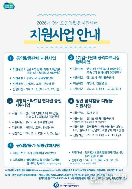 [경기뉴스원/경기뉴스1] | 경기도공익활동지원센터가 ‘2026년 경기도 공익활동 지원사업’에 참여할 도내 공익활동 단체를 모집한다.