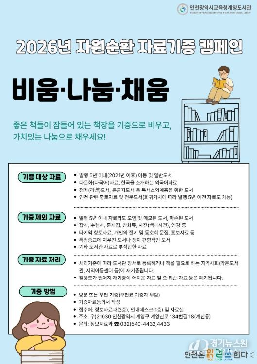 [경기뉴스원/경기뉴스1] | 인천광역시교육청계양도서관은 시민과 지역사회가 함께하는 자원순환형 독서문화 확산을 위해 2026년 자료기증 캠페인 ‘비움·나눔·채움’을 연중 운영한다고 5일 밝혔다.