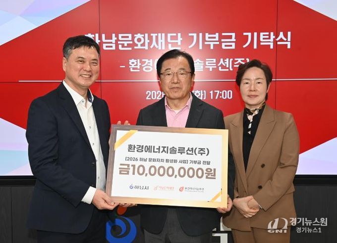 [경기뉴스원/경기뉴스1] | (재)하남문화재단은 2월 4일, 하남시청에서 환경에너지솔루션㈜으로부터 문화자치 활성화를 위한 기부금 1천만 원을 전달받았다고 밝혔다. 이날 기부식에는 이현재 하남시장을 비롯해 기업 및 재단 관계자들이 참석해 지역 상생과 ESG 실천의 의미를 공유했다.