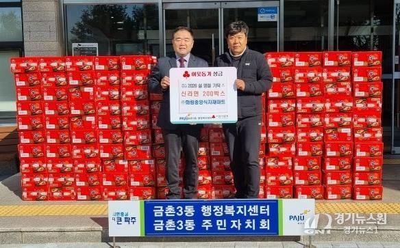 [경기뉴스원/경기뉴스1] | 파주시 금촌3동은 ㈜화림중앙식자재마트 파주금촌역점으로부터 병오년 설 명절을 맞아 지난 3일, 라면(20개입) 200상자를 관내 취약계층과 노인 가구를 위해 기탁하며 따뜻한 나눔을 실천했다.