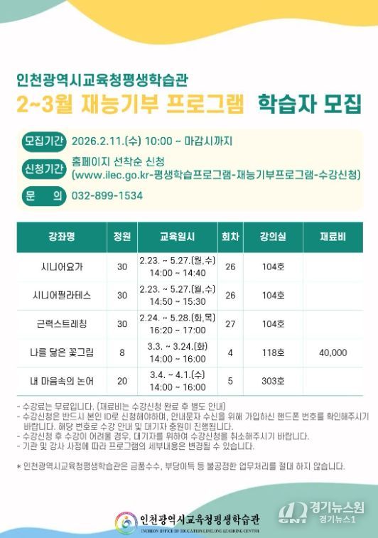 [경기뉴스원/경기뉴스1] | 인천광역시교육청평생학습관은 오는 23일부터 ‘재능기부 프로그램’을 운영한다.