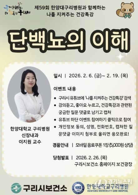 [경기뉴스원/경기뉴스1] | 구리시는 시민의 건강한 생활 실천과 질환 예방을 돕기 위해 6일부터 유튜브를 통해 건강특강 '단백뇨의 이해'를 공개한다고 밝혔다.
