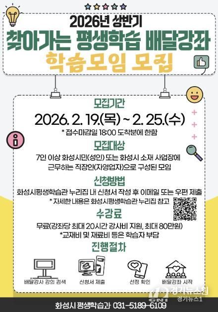 [경기뉴스원/경기뉴스1] | 화성특례시는 2월 19일부터 2월 25일까지 2026년 상반기'찾아가는 평생학습 배달강좌'학습모임을 모집한다.
