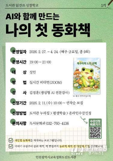[경기뉴스원/경기뉴스1] | 인천광역시교육청화도진도서관은 오는 27일부터 성인 대상 2026년 읽걷쓰 성장학교 1기 ‘AI와 함께 만드는 나의 첫 동화책’ 프로그램을 운영한다.