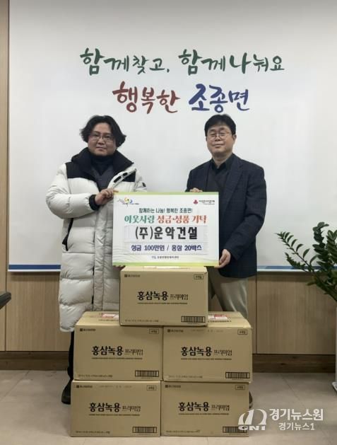 [경기뉴스원/경기뉴스1] | 가평군 소재 운악건설은 설 명절을 앞두고 최근 조종면 행정복지센터를 방문해 성금 100만 원과 홍삼 20박스를 기탁하며 이웃사랑을 실천했다.
