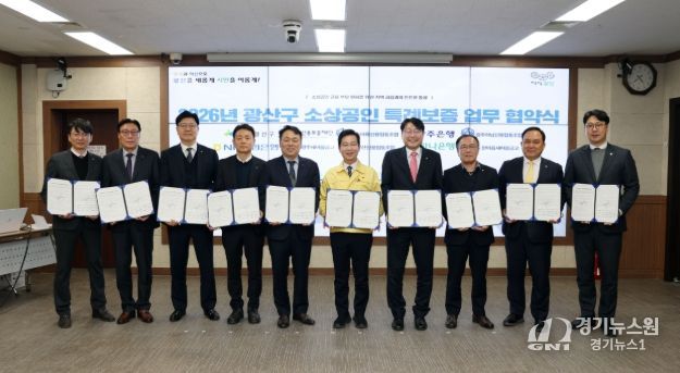 [경기뉴스원/경기뉴스1] | 광주 광산구가 6일 구청 2층 회의실에서 광주신용보증재단(이사장 염규송), 지역 금융기관 8개소(△광주어룡신협·광주하남신협·우산신협 △광주은행 △하나은행 △농협△서광주새마을금고·한마음새마을금고)와 함께 ‘2026년 광산구 소상공인 특례보증 업무협약’을 체결했다.