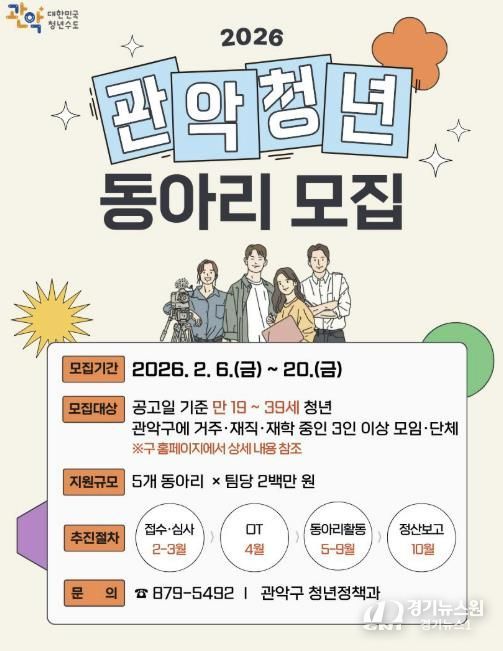 지원 대상은 관악구에 거주하거나 재직·재학 중인 19세 이상 39세 이하의 청년으로 구성된 3명 이상의 모임 또는 주소지가 관악구인 단체다. 활동 분야는 청년들이 자율적으로 선정할 수 있으나, 단순 친목이나 정치·영리·종교 또는 수익 창출 목적을 가진 동아리는 지원 대상에서 제외된다.