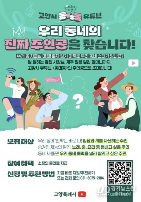 [경기뉴스원/경기뉴스1] | 고양특례시가 44개 동 주민들이 직접 주인공으로 참여하는 신규 유튜브 예능 콘텐츠 ‘동대동(우리 동네 대결)’의 본격적인 제작을 앞두고 ‘우리 동네 대표 선수’를 모집한다고 9일 밝혔다.