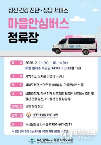 [경기뉴스원/경기뉴스1] | 부산광역시립사하도서관은 오는 2월부터 10월까지 매월 둘째 주 수요일마다 도서관 스마트 평생학습실과 마을안심버스에서 지역주민을 대상으로 ‘마을안심버스 정류장’을 운영한다.
