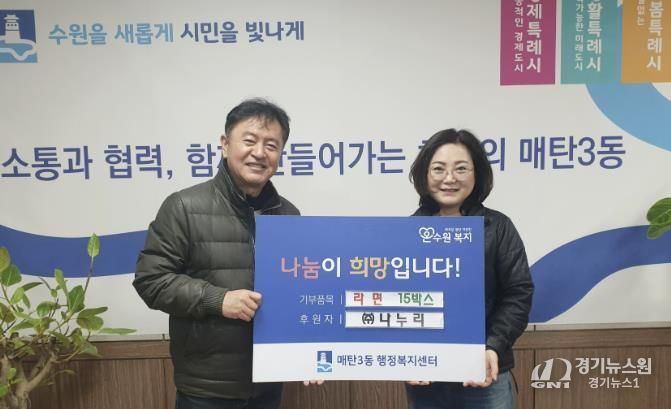 [경기뉴스원/경기뉴스1] | 수원시 영통구 매탄3동 행정복지센터는 지난 6일, 관내 폐기물 수거업체인 ㈜나누리로부터 설 명절을 맞아 어려운 이웃을 위한 라면 15박스를 기탁받았다고 밝혔다.