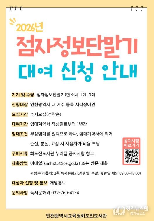 [경기뉴스원/경기뉴스1] | 인천광역시교육청화도진도서관은 인천 거주 시각장애인을 대상으로 ‘점자정보단말기 무상대여 사업’을 운영한다고 9일 밝혔다.