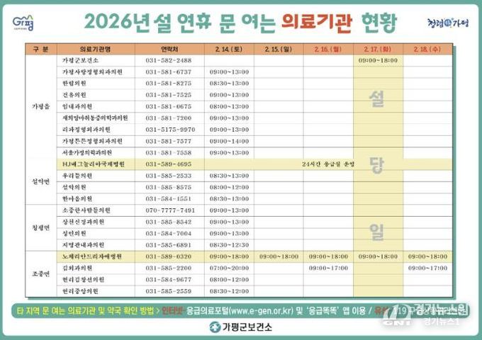 아울러 가평군은 설 연휴 동안 운영하는 의료기관, 약국 정보를 사전에 안내하고 있다. 연휴 기간 문을 여는 의료기관 및 약국 정보는 △가평군청 및 가평군보건소 홈페이지 △119구급상황관리센터 △응급의료포털 △보건복지콜센터에서 확인할 수 있다.
