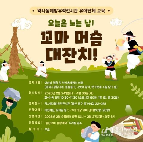 [경기뉴스원/경기뉴스1] | 울산 약사동제방유적전시관이 관내 어린이집과 유치원 원아(5세~7세)를 대상으로 머슴날(음력 2월 1일)과 관련한 교육 프로그램 ‘오늘은 노는 날! 꼬마 머슴 대잔치!’를 운영한다.