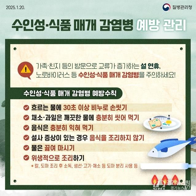 겨울철에 주로 발생하는 노로바이러스 감염증이 최근 영유아(0~6세)와 학생을 중심으로 지속적으로 발생하고 있어 각별한 주의가 요구된다. 노로바이러스는 오염된 음식물뿐만 아니라 환자와의 접촉, 비말 등을 통해서도 전파될 수 있어 많은 사람이 모이는 명절에 확산 위험이 더 높아진다. 파주보건소는 관내 어린이집, 사회복지시설 등 감염 취약시설에 예방수칙 안내문을 배포하고, 위생 관리를 철저히 해줄 것을 당부했다.