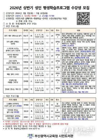 [경기뉴스원/경기뉴스1] | 부산광역시립시민도서관(관장 이은경)은 3월부터 5월까지 유아, 어린이, 성인 등 560여 명을 대상으로 26개 평생학습프로그램을 운영한다. 프로그램은 전 연령층의 다양한 학습 수요를 반영해 구성했으며, 특히 어린이 대상 문해력·수리력 등 기초역량 강화 프로그램을 확대 운영한다.