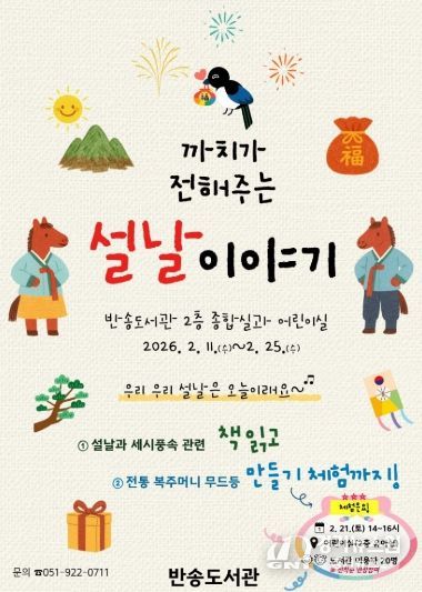 [경기뉴스원/경기뉴스1] | 부산광역시립반송도서관(관장 박미양)은 우리나라 대표 전통 명절 설날을 맞아 사학특성화 프로그램 ‘까치가 전해주는 설날 이야기’를 오는 11일부터 25일까지 운영한다.