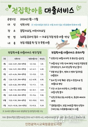 [경기뉴스원/경기뉴스1] | 인천광역시교육청중앙도서관은 지역주민에게 다양한 독서 기회를 제공하기 위하여, 3월부터 11월까지 ‘전집한아름 대출서비스’를 운영한다.