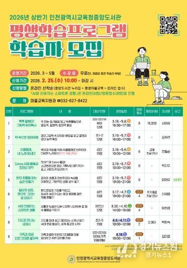 [경기뉴스원/경기뉴스1] | 인천광역시교육청중앙도서관은 주민의 평생교육 기회를 확대하기 위하여 오는 25일부터 ‘상반기 평생학습프로그램’ 학습자를 모집한다