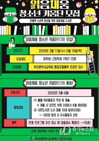 [경기뉴스원/경기뉴스1] | 부산광역시립시민도서관은 올 한 해 동안 어린이와 청소년의 기초 문해력과 수리력 향상, 자기주도적 독서습관 형성을 지원하기 위해 ‘어린이·청소년 읽음채움 도서관’을 운영한다.