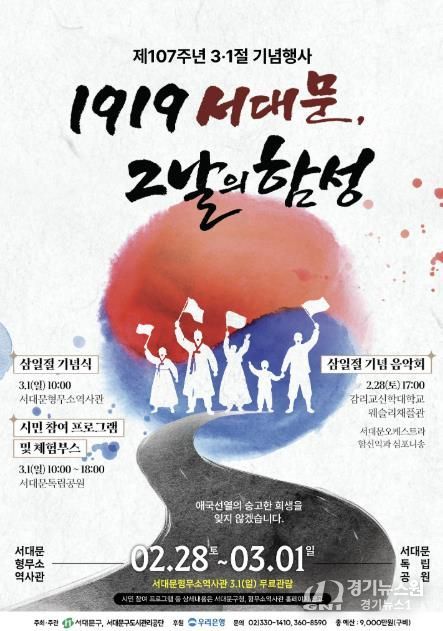 [경기뉴스원/경기뉴스1] | 서대문구가 제107주년 삼일절인 3월 1일 서대문독립공원과 서대문형무소역사관 일대에서 ‘1919 서대문, 그날의 함성’을 개최한다. 삼일절 하루 전인 이달 28일에는 감리교신학대학교 웨슬리채플관에서 삼일절 기념음악회도 열린다.