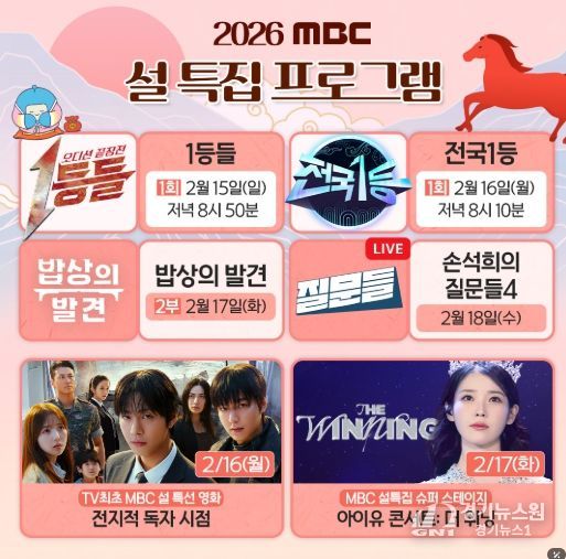 [경기뉴스원/경기뉴스1] | MBC가 2026년 설 명절을 맞아 웃음과 감동, 그리고 깊이 있는 이야기를 담은 명절 특집 라인업을 선보인다. 설 연휴의 포문을 여는 신규 프로그램부터 특선영화와 콘서트까지 다채롭게 구성된 이번 설 특집은 연휴 기간을 풍성하게 채울 예정이다.