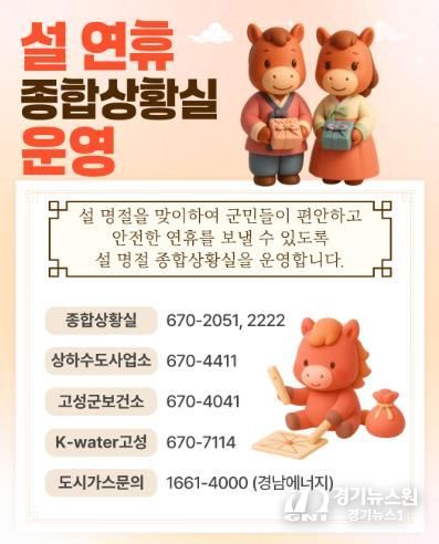 한편, 연휴 중 각종 불편사항 신고는 고성군청 당직실로 연락하면 된다.