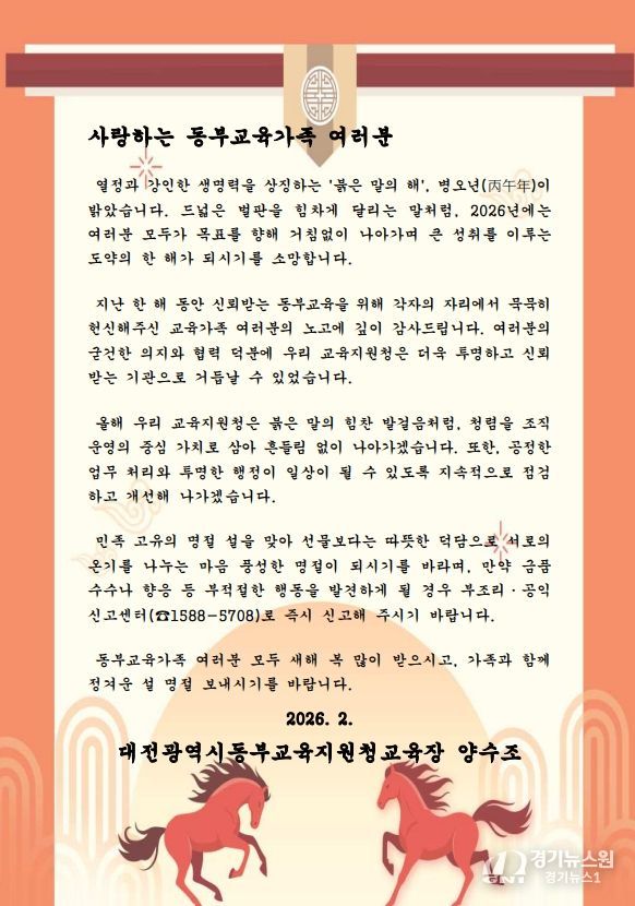 [경기뉴스원/경기뉴스1] | 대전동·서부교육지원청은 설 명절을 맞이하여 청렴 실천의지를 담은 교육장 서한문을 관내 유·초·중학교 및 교육지원청 교직원들에게 발송했다고 밝혔다.