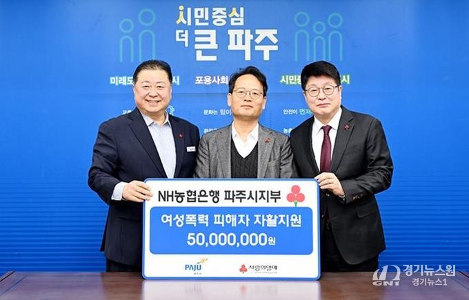[경기뉴스원/경기뉴스1] | 파주시는 지난 11일 엔에이치(NH)농협은행 파주시지부가 여성폭력 피해자의 자립과 회복을 지원하기 위한 후원금 5천만 원을 기탁했다고 밝혔다.