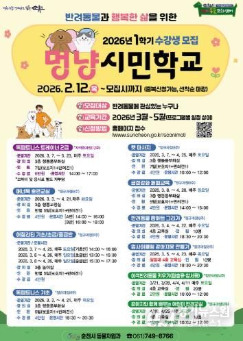 [경기뉴스원/경기뉴스1] | 순천시는 오는 3월부터 반려동물과 반려인을 대상으로 한 시민 교육프로그램인 ‘멍냥시민학교’를 운영한다고 밝혔다.