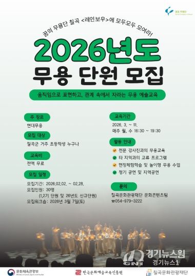 [경기뉴스원/경기뉴스1] | (재)칠곡문화관광재단(이사장 김재욱)은 2025 꿈의 무용단, ‘칠곡’ '레인보우' 단원을 모집한다.